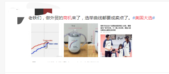 近日,就有网友发帖称,美国大选选票曲线图已被国内厂家印上了T恤。更有外贸卖家调侃道,做外贸的商机来了,选举曲线都要成为卖点。