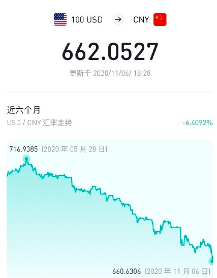 11月6日,离岸人民币兑美元汇率触及6.5917,自2018年6月以来首次上涨突破6.6整数关口。受此影响,境内在岸人民币兑美元汇率也触及6.6081,盘中创下年内新高6.6035。